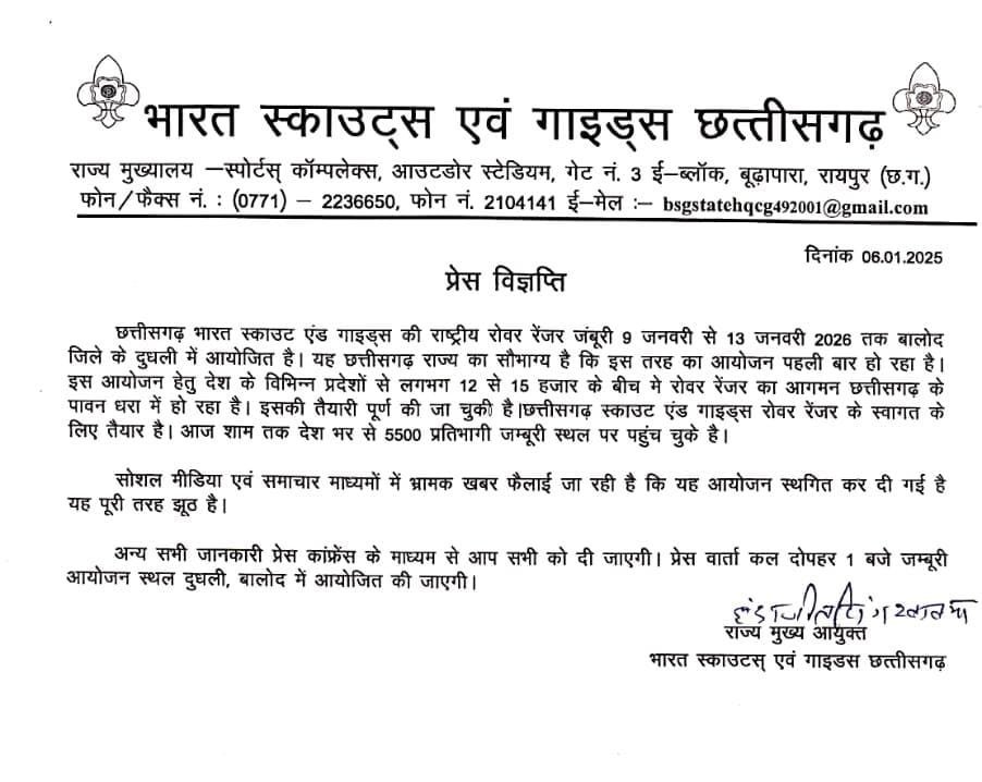 आयोजन से संबंधित अन्य विस्तृत जानकारी प्रेस कॉन्फ्रेंस के माध्यम से प्रदान की जाएगी. प्रेस वार्ता कल दोपहर 1:00 बजे जंबूरी आयोजन स्थल, दुधली, जिला बालोद (छत्तीसगढ़) में आयोजित की जाएगी.