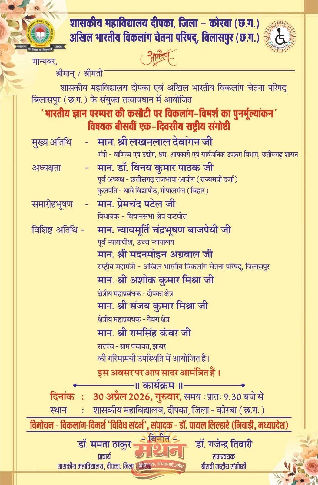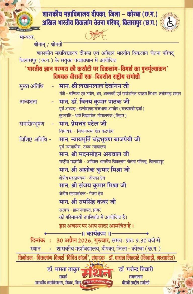 कोरबा (मंथन) कोरबा-पश्चिम शासकीय महाविद्यालय दीपका में महाविद्यालय एवं अखिल भारतीय विकलांग चेतना परिषद बिलासपुर के संयुक्त तत्वावधान में भारतीय ज्ञान परंपरा की कसौटी पर विकलांग-विमर्श का पुनर्मूल्यांकन विषय पर 20वीं एक दिवसीय राष्ट्रीय संगोष्ठी का आयोजन 30 अप्रैल गुरुवार को किया जाएगा।