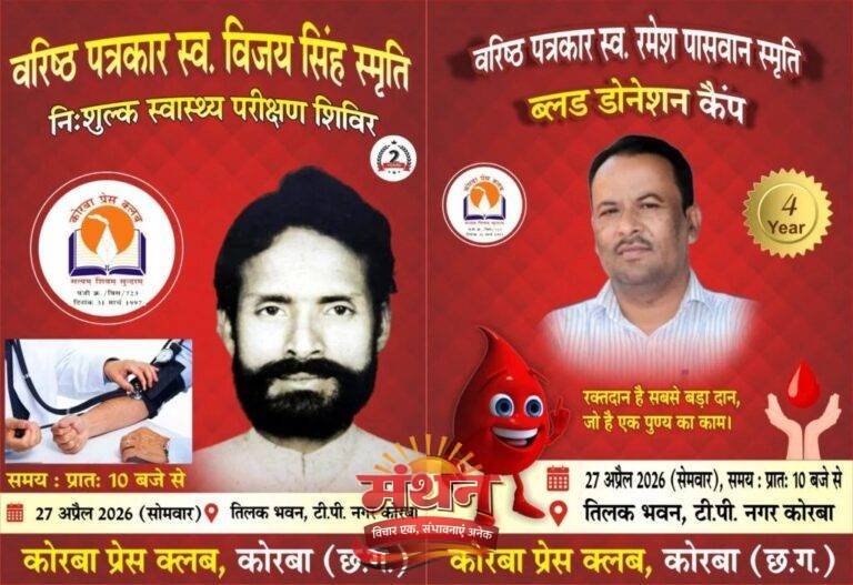 कोरबा (मंथन) कोरबा जिले में पत्रकारिता के क्षेत्र में अपनी अमिट छाप छोड़ने वाले जिले के दो वरिष्ठ पत्रकार स्व. श्री रमेश पासवान और स्व. श्री विजय सिंह की स्मृति में कोरबा प्रेस क्लब द्वारा एक बड़ी सामाजिक पहल की जा रही है।