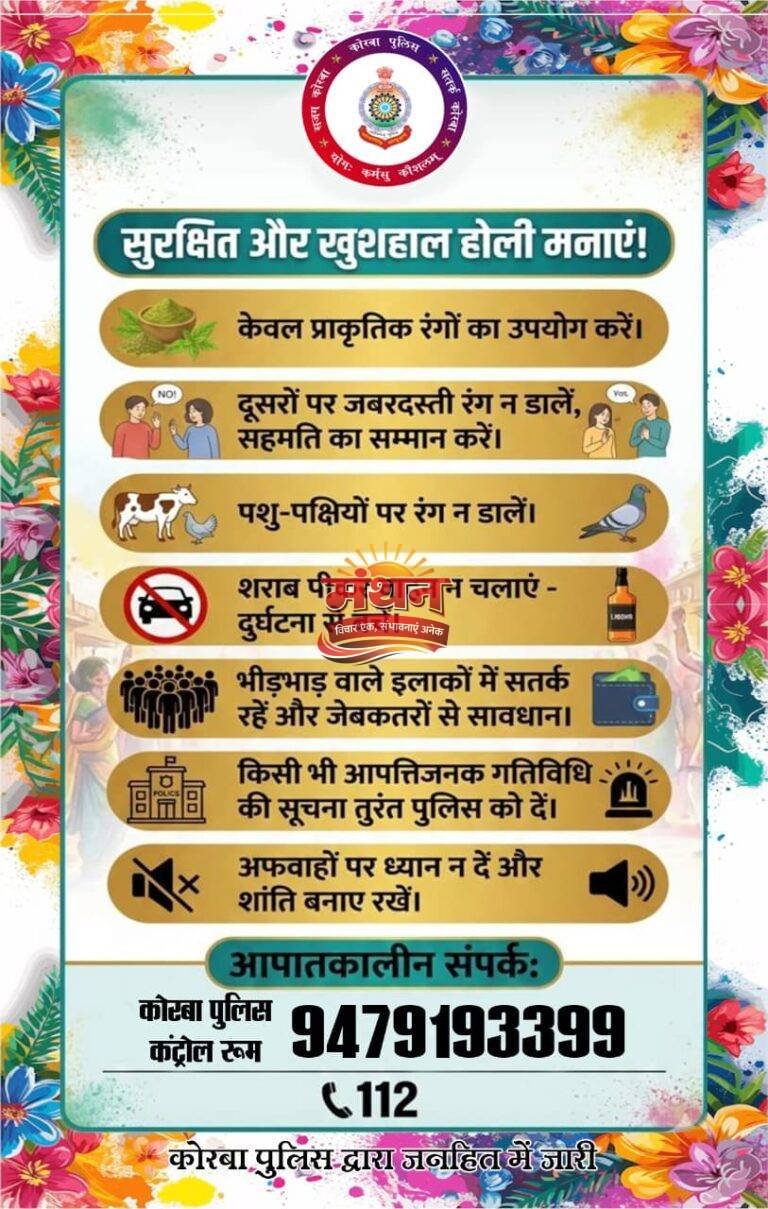 कोरबा जिले में दिनांक 02,03, 04 एवं 05 मार्च को विशेष पुलिस निगरानी रखी जाएगी। उल्लंघन की स्थिति में वैधानिक कार्यवाही सुनिश्चित की जाएगी। आपातकालीन सहायता हेतु कोरबा पुलिस कंट्रोल रूम नंबर 9479193399 एवं डायल 112 जारी किया गया है। कोरबा पुलिस द्वारा नागरिकों से अपील है कि “सुरक्षित होली, जिम्मेदार होली” मनाएं और कानून व्यवस्था बनाए रखने में पुलिस प्रशासन का सहयोग करें।