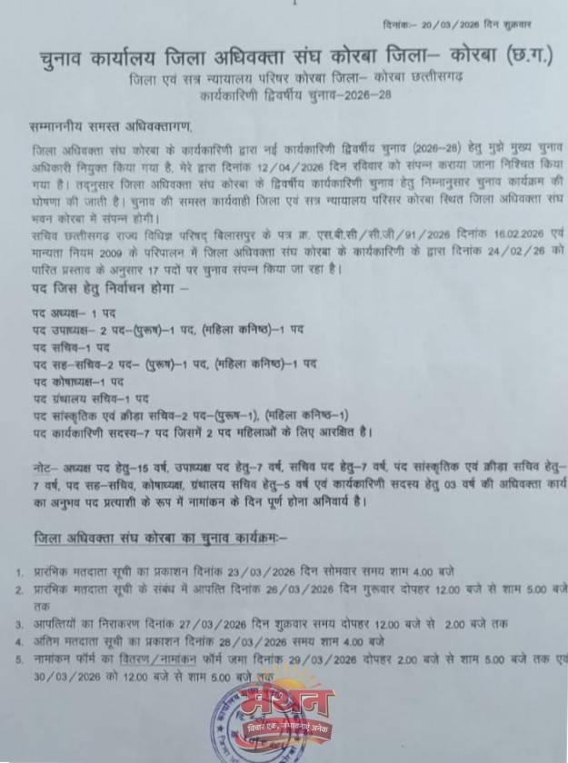कोरबा (मंथन) जिला अधिवक्ता संघ, कोरबा की नई कार्यकारिणी के द्विवार्षिक चुनाव (सत्र 2026-28) के लिए बिगुल फूंका जा चुका है। मुख्य चुनाव अधिकारी द्वारा जारी अधिसूचना के अनुसार आगामी 12 अप्रैल दिन रविवार को मतदान की प्रक्रिया संपन्न कराई जाएगी। चुनाव की समस्त कार्यवाही जिला एवं सत्र न्यायालय परिसर स्थित अधिवक्ता संघ भवन में होगी।