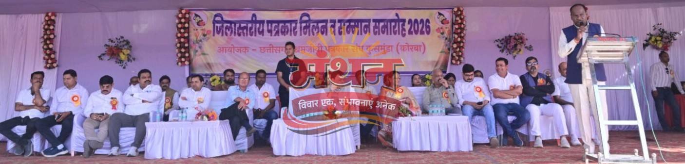 कोरबा (मंथन) कोरबा जिले के जेआरसी खेल मैदान, विकास नगर कुसमुण्डा में जिला स्तरीय पत्रकार मिलन एवं सम्मान समारोह-2026 गरिमामय वातावरण में संपन्न हुआ। कार्यक्रम का आयोजन छत्तीसगढ़ श्रमजीवी पत्रकार संघ की कुसमुण्डा इकाई द्वारा किया गया, जिसमें जिले भर से वरिष्ठ, युवा एवं उभरते पत्रकारों की प्रभावशाली भागीदारी देखने को मिली।