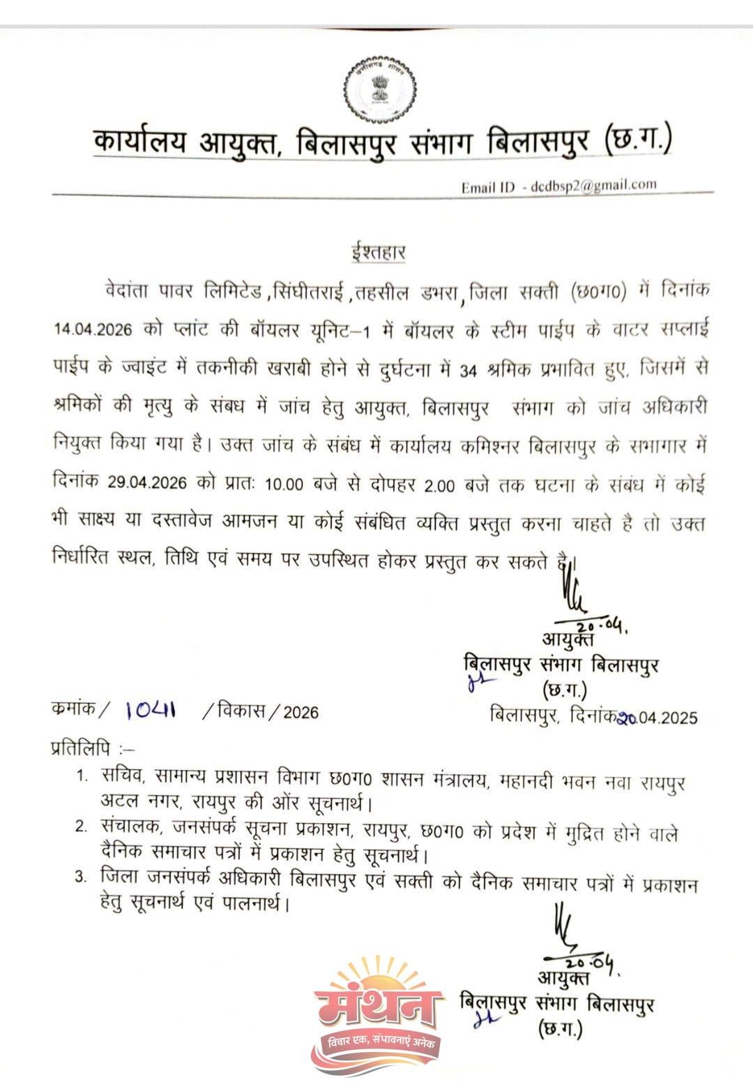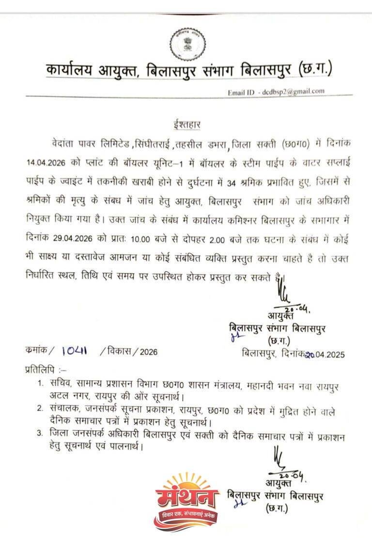 कोरबा (मंथन) कोरबा जिले के समीपवर्ती सक्ती जिले के सिंघीतराई स्थित वेदांता थर्मल पावर प्लांट 14 अप्रैल को बॉयलर यूनिट-1 में तकनीकी खराबी के कारण हुए भीषण बॉयलर ब्लास्ट हादसे में 34 श्रमिक प्रभावित हुए थे, जिनमें से कई श्रमिकों की मृत्यु हुई। इस गंभीर घटना की तह तक जाने और वास्तविक कारणों का पता लगाने हेतु आयुक्त, बिलासपुर संभाग द्वारा जांच अधिकारी नियुक्त किए गए हैं।