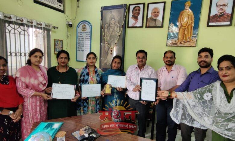 इस उपलब्धि पर उत्साहवर्धन करते हुए महाविद्यालय के प्राचार्य डाॅ. प्रशांत बोपापुरकर ने इन छात्राओं को प्रशस्ति पत्र प्रदान कर सम्मानित किया। इस अवसर पर शिक्षा संकाय की विभागाध्याक्ष डाॅ. भारती कुलदीप, डाॅ. रश्मि शुक्ला, श्रीमती प्रीति द्विवेदी, डाॅ. अंजू खेस्स, नितेश यादव एवं शंकरलाल यादव उपस्थित रहे।