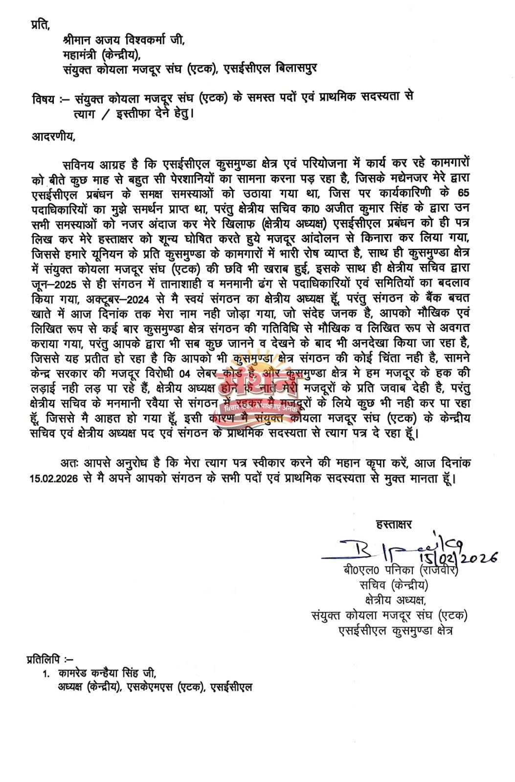 कोरबा) कुसमुंडा एटक के अध्यक्ष ने अध्यक्ष पद से दिया इस्तीफा