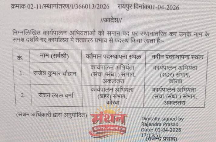 कोरबा (मंथन) कोरबा शहर के बिजली विभाग में प्रशासनिककार्यो में कसावट लाने हेतु बड़ा प्रशासनिक बदलाव किया गया हैं। विद्युत वितरण कंपनी ने कार्यपालन अभियंता (ईई) रोशन वर्मा का तबादला कर दिया गया है। उनकी जगह अब राजेश चौहान को कोरबा शहर का नया कार्यपालन अभियंता (ईई) नियुक्त किया गया है।