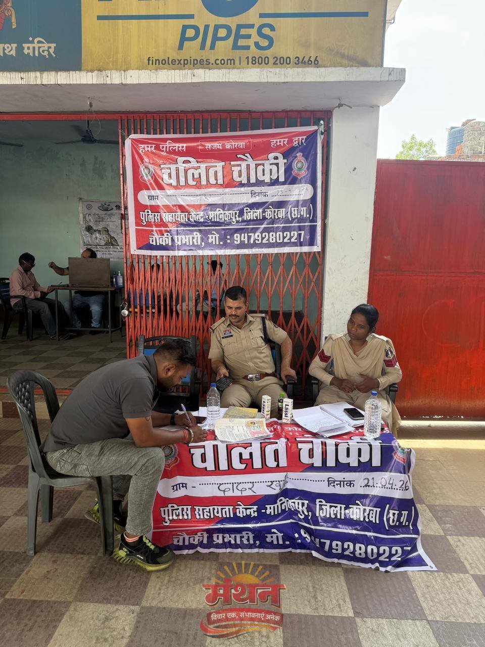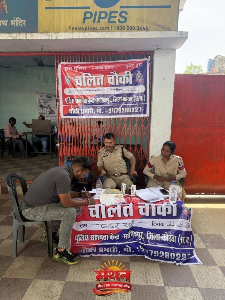 कोरबा (मंथन) कोरबा जिला पुलिस अधीक्षक सिद्धार्थ तिवारी के निर्देशन एवं अतिरिक्त पुलिस अधीक्षक तथा नगर पुलिस अधीक्षक के मार्गदर्शन में 23 अप्रैल को पुलिस सहायता केंद्र मणिकपुर क्षेत्रांतर्गत दादर में “चलित थाना” का सफल आयोजन किया गया। यह अभिनव पहल आम जनता को त्वरित, सुलभ एवं प्रभावी पुलिस सेवा प्रदान करने के उद्देश्य से की गई, जिसके अंतर्गत पुलिस टीम सीधे आमजन के बीच पहुँची। आयोजन स्थल पर अस्थायी पुलिस सहायता केंद्र स्थापित कर नागरिकों की शिकायतें दर्ज की गईं एवं उनकी समस्याओं को गंभीरता से सुना गया।