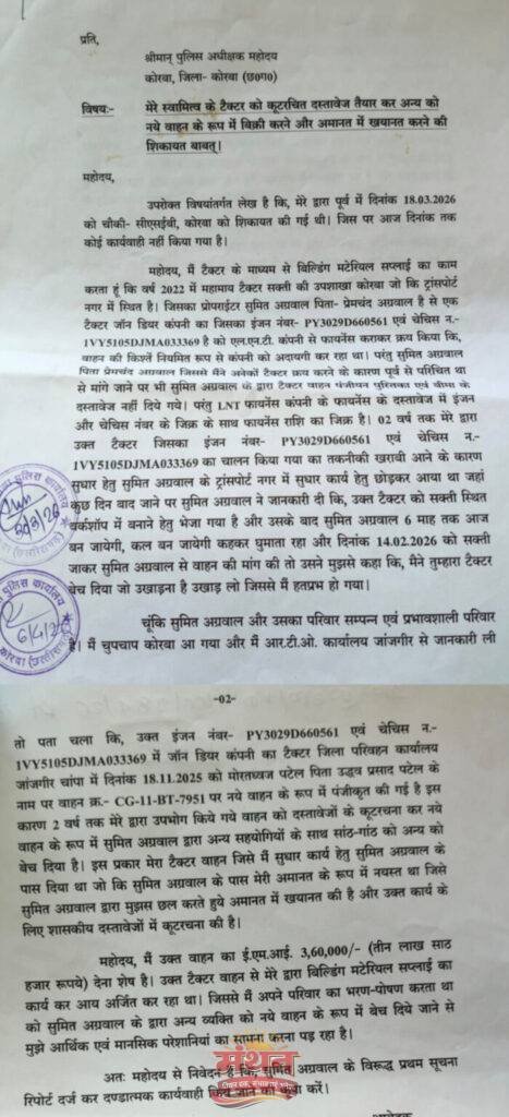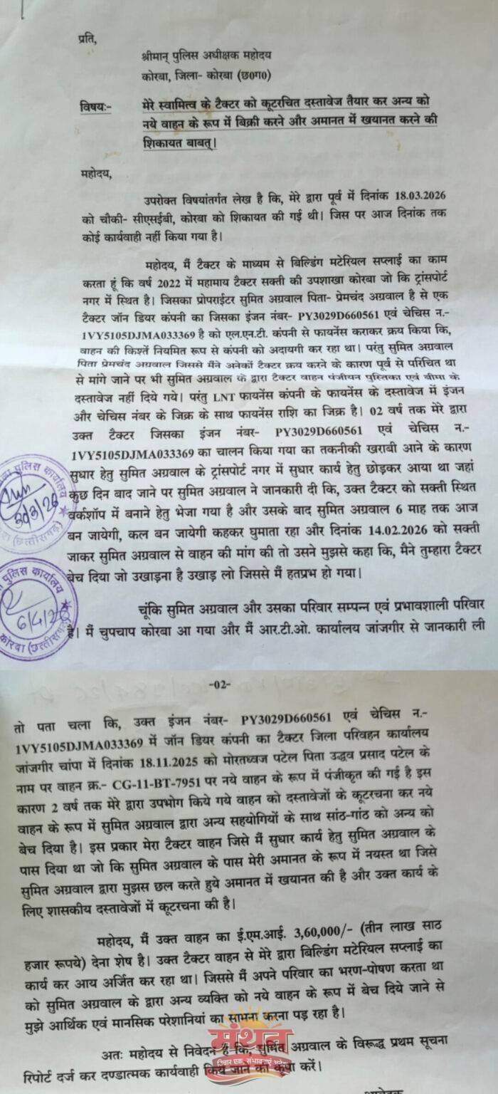 इस मामले के पीड़ित निवासी कोरबा ने कोरबा जिला पुलिस अधीक्षक से की गई शिकायत में बताया कि मेरे द्वारा पूर्व में 18 मार्च को चौकी-सीएसईबी, कोरबा को शिकायत की गई थी। जिस पर आज दिनांक तक कोई कार्यवाही नहीं हुई हैं। मैं टैक्टर के माध्यम से बिल्डिंग मटेरियल सप्लाई का काम करता हूं। वर्ष 2022 मेंएक ट्रैक्टर सक्ती की उपशाखा जो की कोरबा ट्रांसपोर्ट नगर में स्थित है। जिसके प्रोपराईटर से एक टैक्टर जॉन डियर कंपनी का जिसका इंजन नंबर- PY3029D660561 एवं चेचिस न.-1VY5105DJMA033369 है, को एल.एन.टी. कंपनी से फायनेंस कराकर क्रय किया। वाहन की किश्तें नियमित रूप से कंपनी को अदायगी कर रहा था। परंतु संचालक जिससे में पूर्व में भी अनेकों टैक्टर क्रय करने के कारण पूर्व से परिचित था, से मांगे जाने पर भी उसके द्वारा टैक्टर वाहन पंजीयन पुस्तिका एवं बीमा के दस्तावेज नहीं दिये गये। परंतु एलएनटी फायनेंस कंपनी के फायनेंस के दस्तावेज में इंजन और चेचिस नंबर के जिक्र के साथ फायनेंस राशि का जिक्र है। 02 वर्ष तक मेरे द्वारा उक्त ट्रेक्टर जिसका इंजन नंबर- PY3029D660561 एवं चेचिस न.-1VY5105DJMA033369 का चालन किया गया। तकनीकी खराबी आने के कारण सुधार हेतु संचालक के यहां ट्रांसपोर्ट नगर में छोड़कर आया था। जहां कुछ दिन बाद जाने पर मुझे जानकारी दी गयी की उक्त टैक्टर को सक्ती स्थित वर्कशॉप में बनाने हेतु भेजा गया है, उसके बाद संचालक के द्वारा 6 माह तक घुमाया जाता रहा। 14 फरवरी को सक्ती जाकर संचालक द्वारा वाहन की मांग की गयी तो मुझसे कहा गया कि, मैने तुम्हारा टैक्टर बेच दिया, जिससे मैं हतप्रभ हो गया।