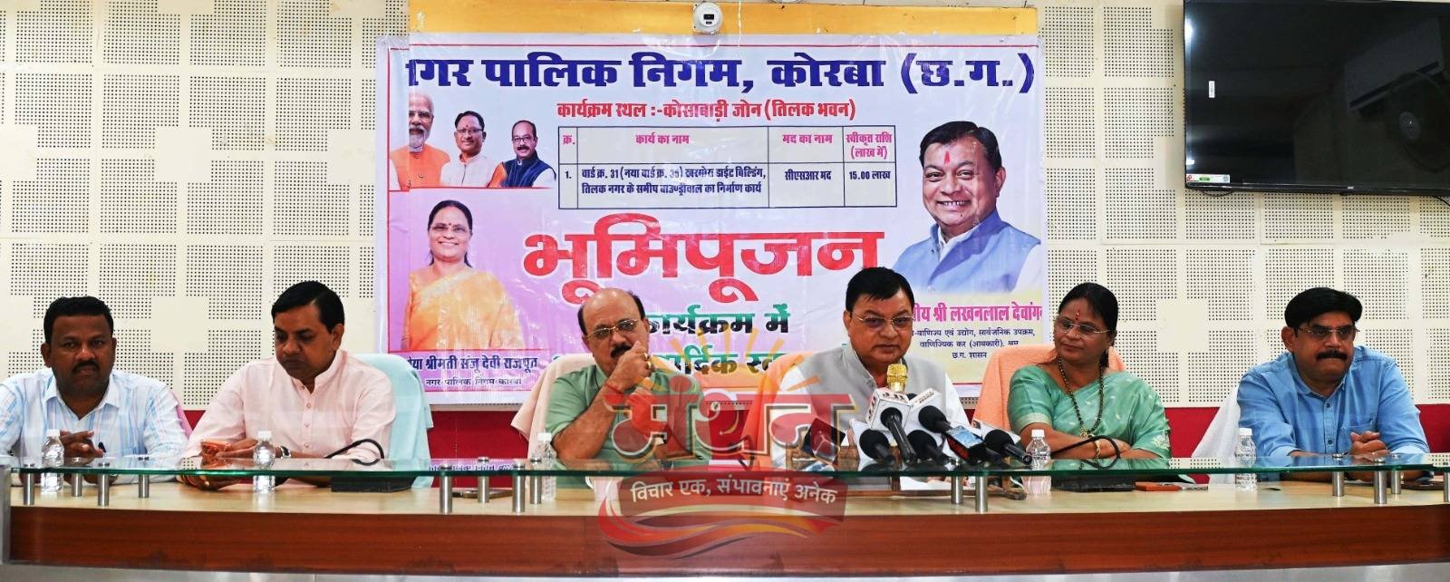 कार्यक्रम अंतर्गत नगर पालिक निगम कोरबा द्वारा वार्ड क्र. 35 खरमोरा डाईट बिल्डिंग तिलक नगर पत्रकार कालोनी के समीप एन.टी.पी.सी. के सीएसआर मद से 15 लाख रूपये की लागत से बाउण्ड्रीवाल का निर्माण कार्य कराया जाना हैं, जिसका वर्चुअल भूमिपूजन कैबिनेट मंत्री लखनलाल देवांगन के मुख्य आतिथ्य एवं महापौर श्रीमती संजूदेवी राजपूत की अध्यक्षता में तिलक भवन में आयोजित कार्यक्रम के दौरान उनके हाथों किया गया। इसी प्रकार वार्ड क्र. 24 तिलक भवन प्रेस क्लब में पार्षद पंकज देवांगन के पार्षद मद से एलईडी प्रोजेक्टर, स्मार्ट टी.व्ही., साउण्ड सिस्टम व स्क्रीन स्थापना आदि का कार्य कराया गया है, जिसका लोकार्पण भी कैबिनेट मंत्री श्री देवांगन के करकमलों से सम्पन्न हुआ।