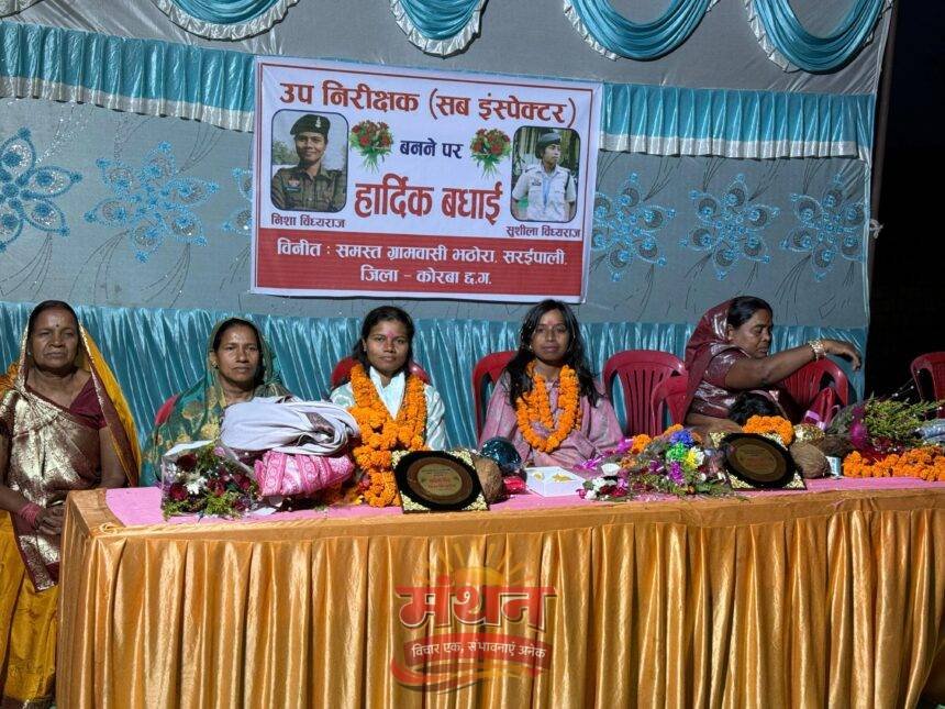 कोरबा (मंथन) कोरबा-पश्चिम अंतर्गत नगर पालिका बांकीमोंगरा के वार्ड नंबर 19 के ग्राम भठोरा सरईपाली में उत्साह और गौरव का वातावरण व्याप्त है। जानकारी के अनुसार ग्राम की दो होनहार युवतियों कु. निशा विंध्यराज (पुत्री स्व. प्यारे लाल विंध्यराज) एवं कु. सुशीला विंध्यराज (पुत्री लाहोरन विंध्यराज) का पुलिस उप-निरीक्षक के पद पर चयन होने के उपलक्ष्य में ग्रामवासियों द्वारा एक भव्य स्वागत एवं सम्मान समारोह आयोजित किया गया।