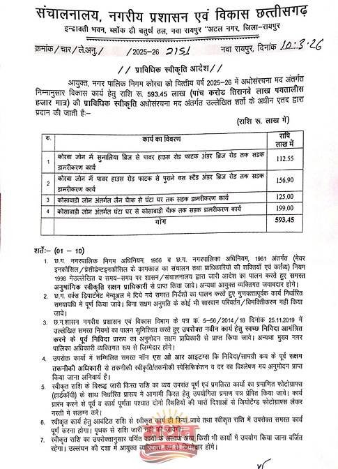 प्रदेश के कैबिनेट मंत्री लखन लाल देवांगन के सशक्त नेतृत्व का कोरबा नगर वासियों को निरंतर लाभ मिल रहा है। विगत डेढ़ महीने के भीतर लगातार विकास कार्यों की स्वीकृति राज्य शासन से नगर निगम कोरबा को मिल रही है। इसके पूर्व सीएसईबी चौक से कोसाबाडी तक गौरव पथ हेतु 36 करोड़ की स्वीकृति प्राप्त हुई। रानी रोड कोरबा से सर्वमंगला मंदिर के बीच हसदेव नदी पर रपटा निर्माण की स्वीकृति, अधोसंरचना विकास एवं पर्यावरण उपकर निधि से 15 विभिन्न विकास कार्यों हेतु 2 करोड़ की स्वीकृति प्राप्त हुई थी।