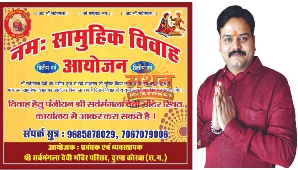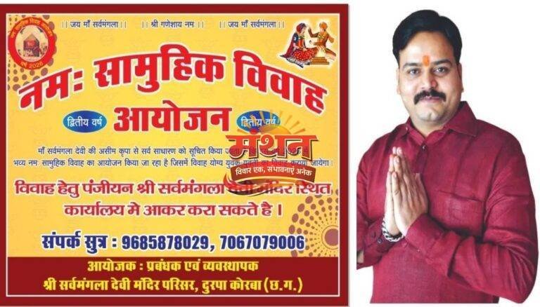 कोरबा (मंथन) कोरबा अंचल के ख्याती प्राप्त आस्था स्थल माँ सर्वमंगला देवी मंदिर परिसर दुरपा में पुनः 31 गरीब कन्याएं फिर से परिणय सूत्र में आबद्ध होंगे। माँ सर्वमंगला देवी मंदिर दुरपा, कोरबा के प्रबंधक/पुजारी/राजपुरोहित नमन पाण्डेय (नन्हा महराज) ने जानकारी देते हुए बताया कि माता रानी की असीम कृपा से मंदिर परिसर में 31 गरीब कन्याओं का सामूहिक विवाह का आयोजन किया जा रहा है। इसके लिए तैयारी प्रारंभ कर दी गई है और शीघ्र ही तिथि की घोषणा की जाएगी।