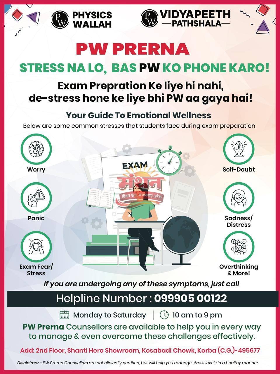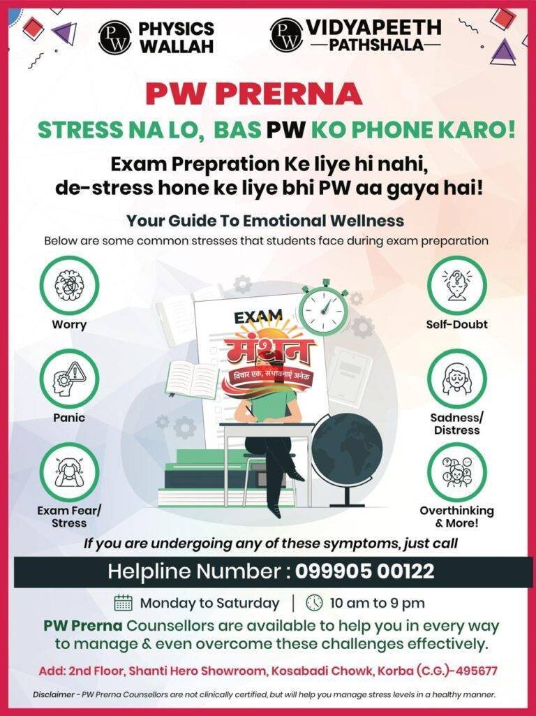 लेकिन ऐसे संवेदनशील दौर में फिजिक्स वल्लाह विद्यापीठ पाठशाला, कोरबा ने एक जिम्मेदार और सराहनीय पहल करते हुए “PW प्रेरणा – Your Guide to Emotional Wellness” हेल्पलाइन शुरू कर विद्यार्थियों को भावनात्मक सहारा देने का ठोस प्रयास किया है। यह पहल केवल एक औपचारिक सुविधा नहीं, बल्कि उन विद्यार्थियों के लिए जीवनरेखा साबित हो सकती है, जो परीक्षा के दबाव, असफलता के डर, आत्म-संदेह और मानसिक उलझनों से जूझते हुए खुद को अकेला महसूस कर रहे हैं।